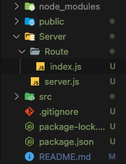 express 모듈이 설치되면 서버를 구동할 server 폴더를 만들고, 서버를 열 server.js을 만들고 라우팅을 담당할 Route 폴더와 Route 폴더에 index.js를 만들어준다.
